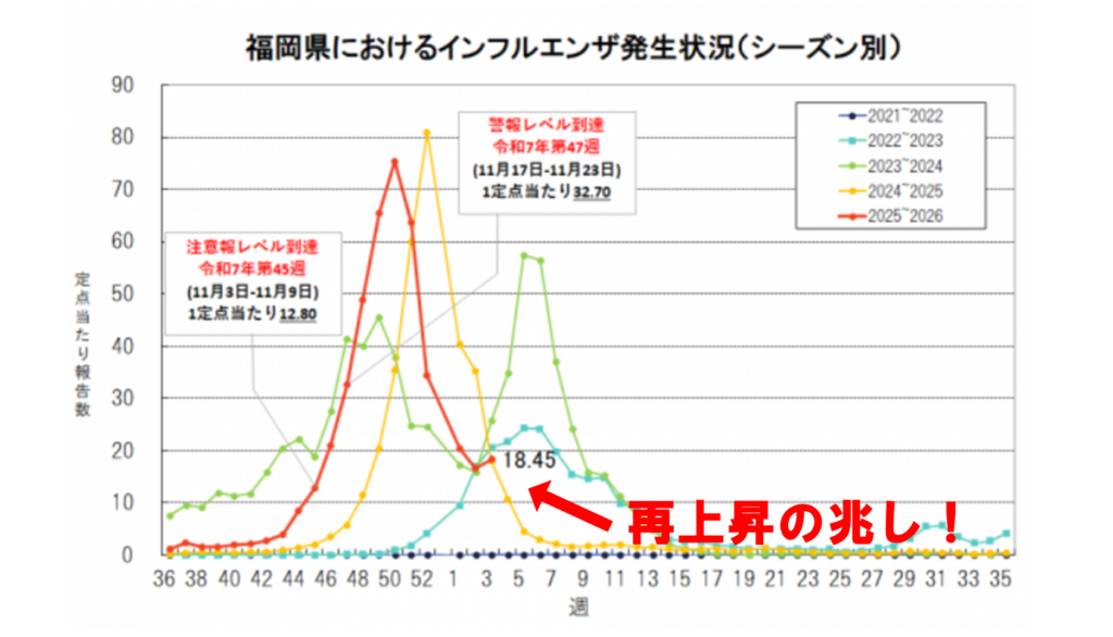 インフルエンザ警報9週連続 2026 1/23 お知らせ 2026年1月23日 福岡県は、18日までの1週間のインフルエンザ感染者数が前の週より増え、9週連続で警報レベルとなったと発表しました。 1医療機関あたり18.45人となり、 前の週にくらべ1.11倍に増えています。当院でも 年末以降、インフルエンザB型が増えています。あらためて、手洗いや適切なマスクの着用など基本的な感染防止対策を行ってください。 お知らせ 1月27日午後休診のお知らせ
