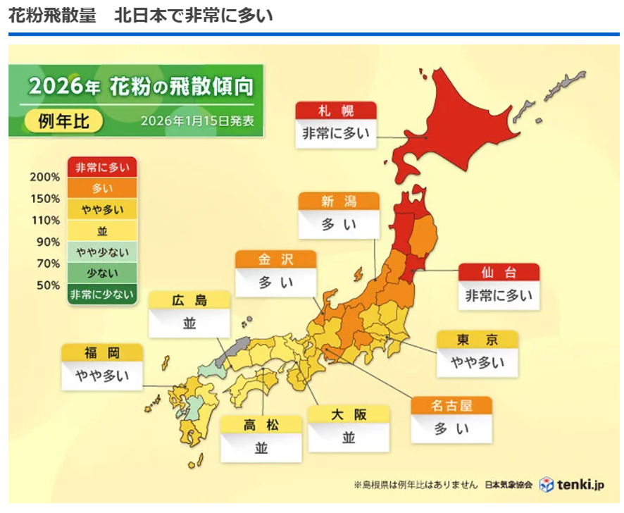 九州や東海の早い所では2月上旬から飛散開始となり、九州から関東は2月中旬には広い範囲で本格的な花粉シーズンとなるでしょう。』と発表しました。