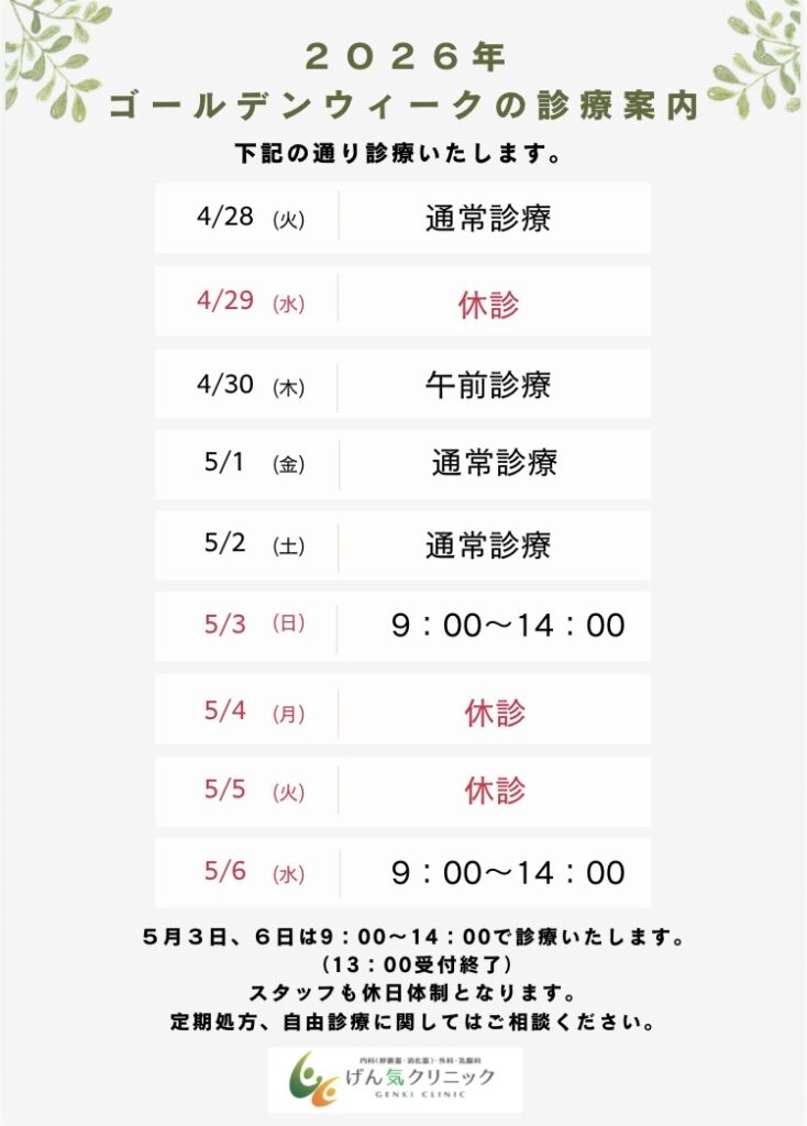 ゴールデンウィーク期間中の5月3日、6日 9時~14時まで臨時診療をいたします。