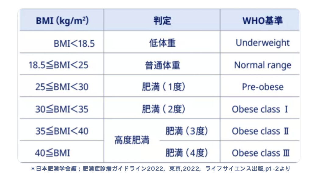 参考: 日本では、日本肥満学会が判定する肥満の定義はBMI 25kg/m2以上です。